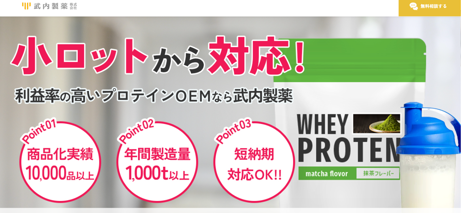 武内製薬は、年間1,000トン以上のプロテインを製造する規模を活かし、原料の一括輸入でコストを抑え、高い利益率を実現できるOEMメーカーです。