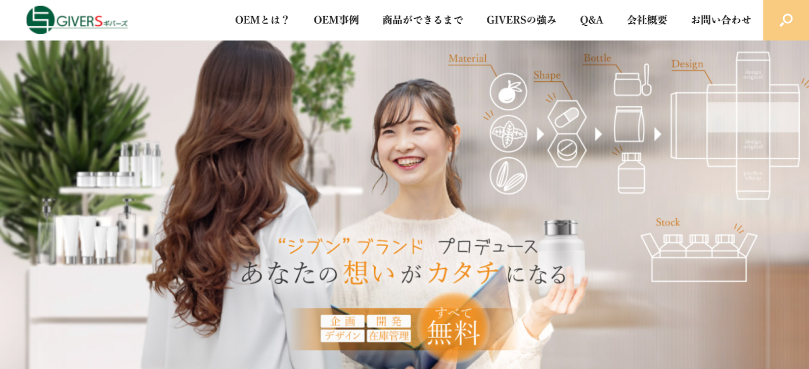 GIVERSは化粧品やサプリメントなどの美容・健康専門のOEMメーカーです。サロン経営者やインフルエンサーなど、自分の名前とストーリー、想いを製品化しブランドを育てたい人におすすめです。